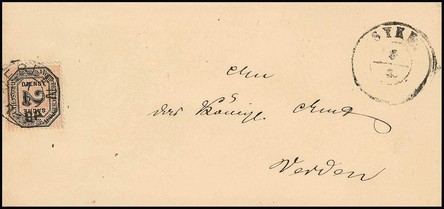 "Syke", nachverw. schwarzer K2 auf 15 NDP Briefen 1 u. 2 Gr., dabei nebengesetzte Gemeindestempel von Heiligenrode und Ristedt, sowie Brief mit Dienst 2 Gr., in Syke aufgegeben, aber erst am Empfangsort entwertet. Dazu drei unfrankierte Briefe und ein Postschein