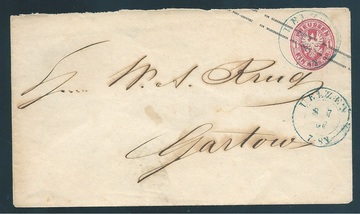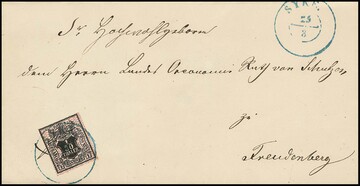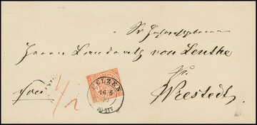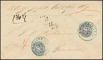 "Twistringen", nachverwendeter blauer K2 auf Wertcouvert mit zweimal Preußen 2 Sgr., ferner auf zwei Briefen Preußen 1 Sgr. (kl. Mgl.)