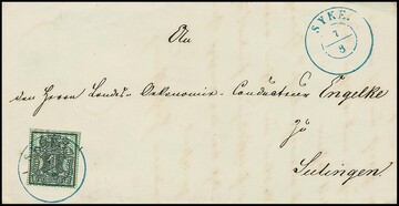 "Syke", blauer K2 auf zwei Kabinettbriefen mit Randstücken 1 Ggr. schw./graugrün und 1 Gr. lilarot, auf Briefvs. 1 Ggr., sowie nachverw. auf Kabinettbrief Preußen 1 Sgr.