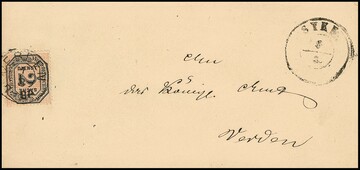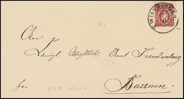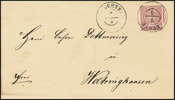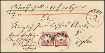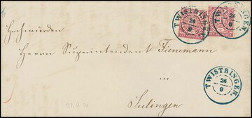 "Twistringen", nachverw. K2 klar auf Brief mit Deutsches Reich 10 Pfge. in seltener "blutroter" Nuance (Mi. 350,-), sowie auf Brief mit Randstück 10 Pfge.