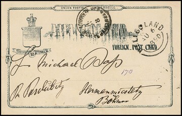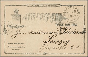 Ganzsachenkarte 10 Pfg. 1885 von Helgoland (Rundstempel) nach London gelaufen