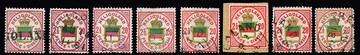 5 Pfg. karmin/grün, 1. Auflage, acht Exemplare als Dokumentation des Verwendungszeitraumes, drei Exemplare mit Langstempel, fünf (zwei Bfst.) mit Ortsstempel aus 1880 bis 1890, zwei kleine Zahnfehler, meist sign.