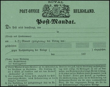 Post-Mandat, (1875), seltenes ungebrauchtes Helgoland-Formular in bei Lemberger nicht verzeichneter Type ohne Währungsangabe