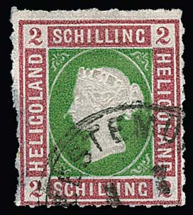 2 Sch. lilakarmin/gelbgrün (kl. Mgl., u.a. unten dünn) mit seltener Doppelentwertung durch Rundstempel von Helgoland aus Juli 1868 und schwarzen K1 von Hamburg