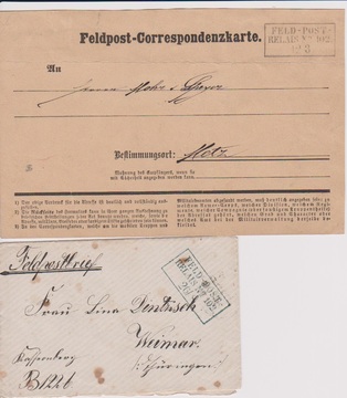 Feldpost, 1871, 12.3., 26.8., "Velars", "Rentilly", "FELDPOST-RELAIS NO. 102", schwarzer und blauer Ra3 auf Correspondenzkarte und Brief (kl. Mängel) nach Metz bzw. Weimar