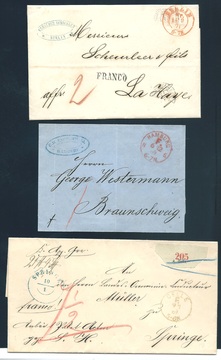 1868-1871, sieben Briefe mit Franko-Stempeln, Celle, Chemnitz, Erfurt und Harburg in violett, sowie Berlin, Oldenburg und Hamburg in rot