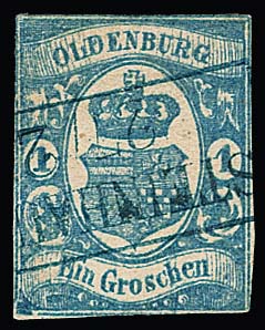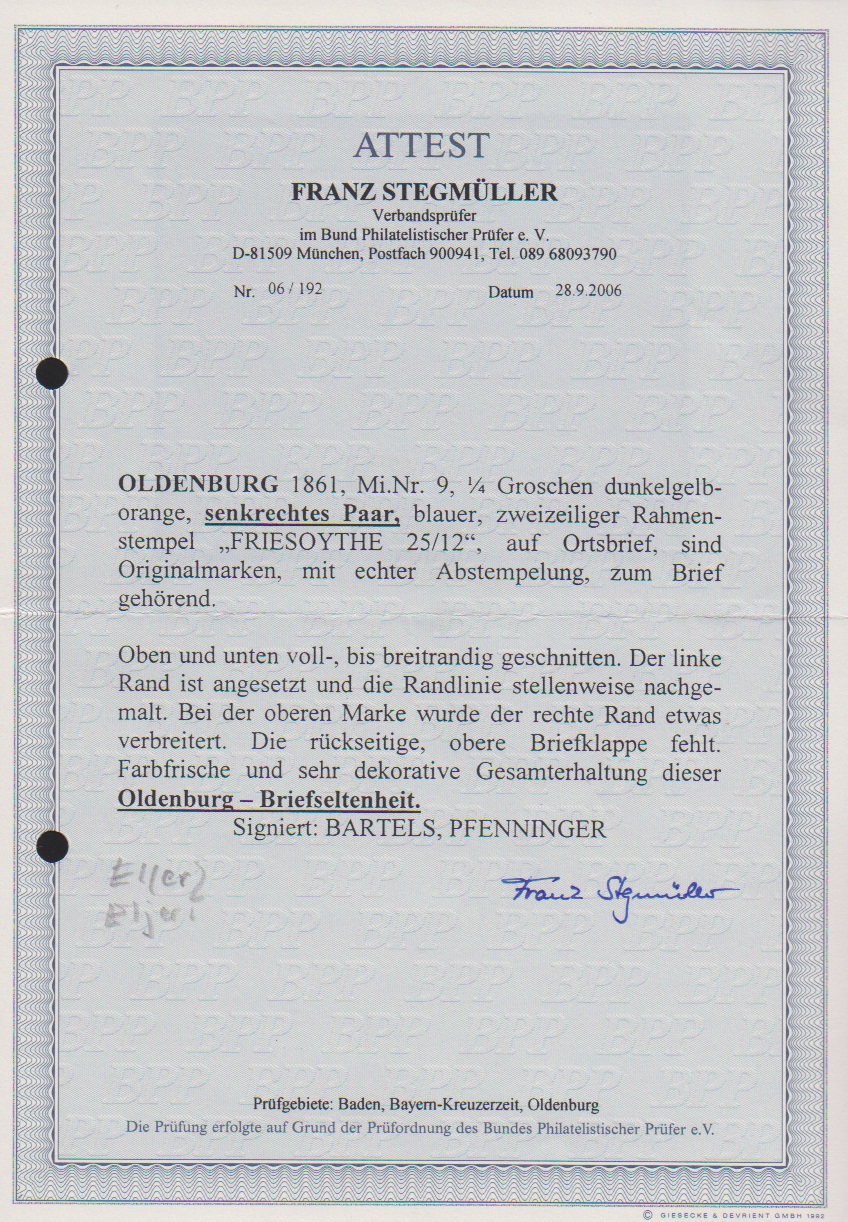 1/4 Gr. orange, senkrechtes Paar mit ganz markanter Klischee-Verschiebung auf kleinem Nahbereichs-Briefchen (rs. fehlt ein Klappenteil, belanglos) mit Ra2 "Friesoythe" klar. Durch diese Klischee-Verschiebung waren die Marken teils angeschnitten und sind an den Rändern links repariert bzw. oben rechts Rand etwas verbreitert, dennoch ein optisch atttraktiver und schön gestempelter Brief dieser Oldenburg-Seltenheit. Mi. 40.000,-, sign. Pfenninger, Bartels und Attest Stegmüller. Es gibt gesamt 11 Briefe mit Paaren dieser Marke, davon neun waagerechte und nur zwei senkrechte, also nur noch ein weiteres senkrechtes Paar auf Brief! Foto siehe Titelseite