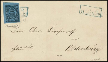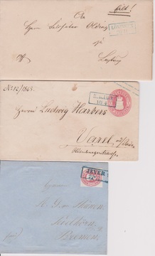 1 Gr. karmin, Kabinettstück auf Faltbrief mit Ra2 "Jever", sign. Brettl, ferner Ganzsache 1 Gr. mit Ra2 "Burhave" und markenloser Brief 1867 mit rs. seltenem K2 "Larstrup"