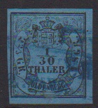 1/30 Th. schw./blau, breitrandiges Prachtstück mit dem Plattenfehler "Rahmen unten gebrochen" (aus Unkenntnis teils übermalt), Fotoexp. Brettl