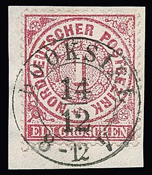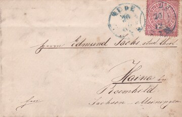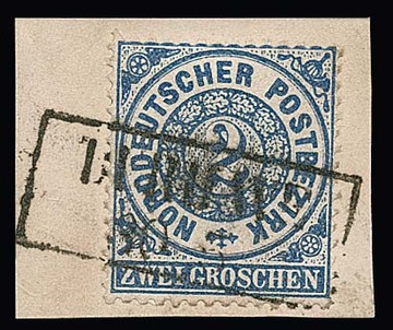"Damme", nachverwendeter blauer Ra2 vom 1.1., also Ersttag 1868 (da später nicht mehr in blau verwendet) auf Briefstück mit NDP 1 Gr. (kl. Randfehler)