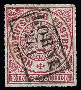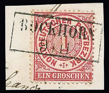 1 Gr. karmin, Kabinettstück auf Faltbrief mit Ra2 "Jever", sign. Brettl, ferner Ganzsache 1 Gr. mit Ra2 "Burhave" und markenloser Brief 1867 mit rs. seltenem K2 "Larstrup"