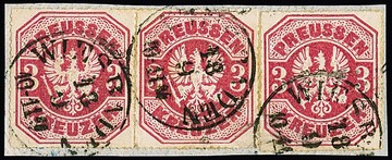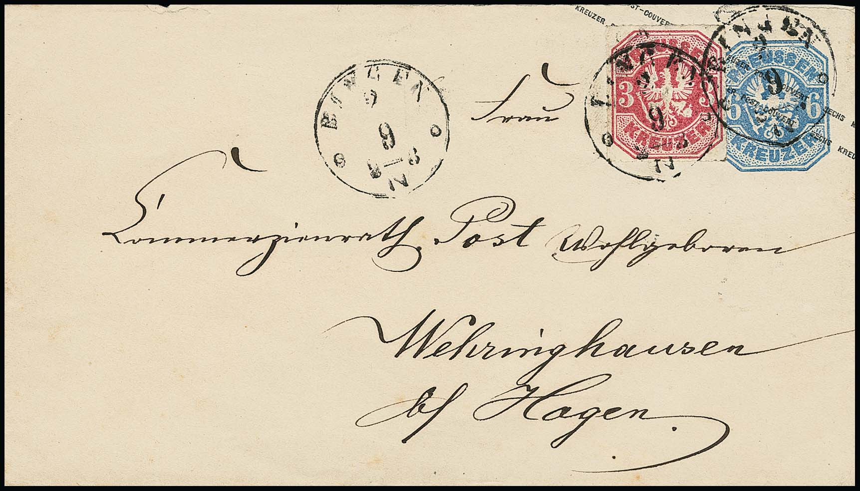 3 Kr. karmin, perfektes Exemplar auf Ganzsache 6 Kr. hellblau, mit K1 "Bingen" nach Hagen, rs. geringe Öffnungsmgl., im Preußen-Rundbrief Nr. 156 auf S. 48 beschrieben, sign. Banker, dazu Ganzsache 9 Kr., ebenfalls im Preußen-Rundbrief beschrieben