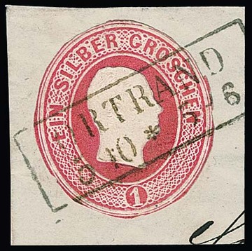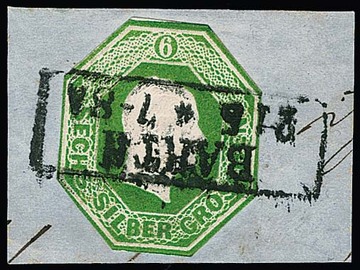 Oktogon-Ganzsachen-Ausschnitt 6 Sgr. grün, üblich achteckig geschnitten, auf Briefstück mit Ra2 "Barth", sign. Banker. Mi. 400,-