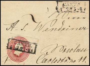 Kopf-Ganzsachen-Ausschnitt 1 Sgr. rot, kurios teils eckig, teils vollrandig rund geschnitten, auf Briefchen aus Canth