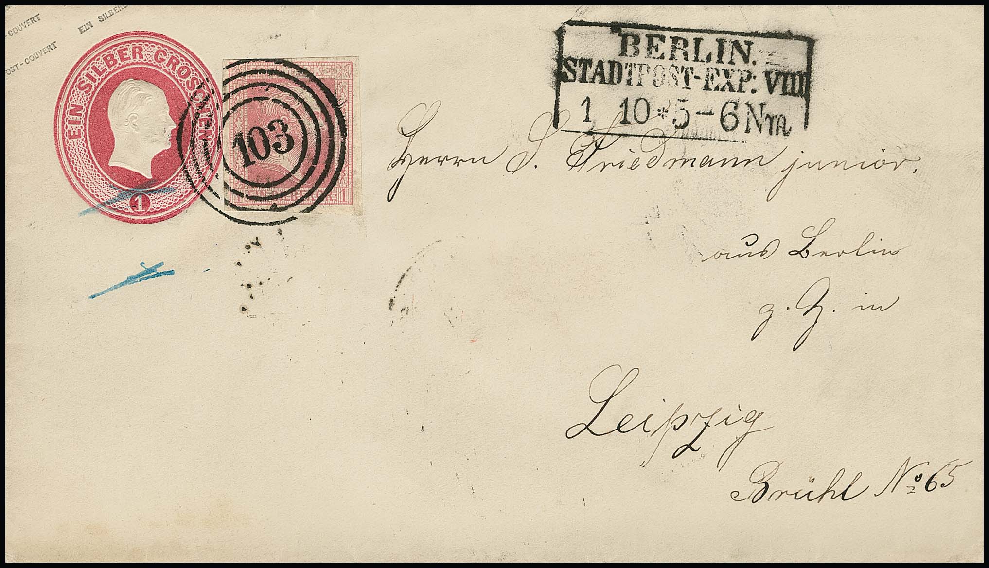 1 Sgr. rosa mit NS "103" und Neben-Ra3 "Berlin Stadtpost-Exp. VIII" auf zwei Ganzsachen 1 Sgr. rosa aus gleicher Korrespondenz nach Leipzig, Pracht/Kabinett