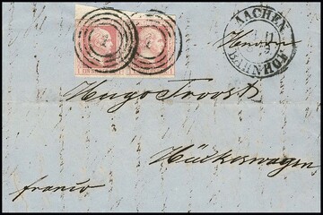 1 Sgr. rosa, seltenes Oberrandpaar mit teils breitem Bogenrand auf Prachtbrief mit NS "1" und großem K2 "Aachen Bahnhof" 1857 nach Hückeswagen, sign. Banker