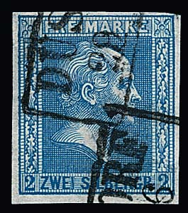 2 Sgr. blau (kl. Mgl.) mit seltener Fremdentwertung durch dänischen NS "1" (Kopenhagen)