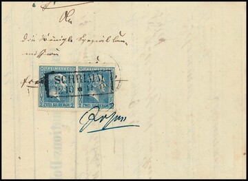 2 Sgr. blau, perfektes Paar auf Post-Ins.-Doc. (typisch etwas verkürzt) mit Ra2 "Schrimm" 1860 nach Posen. Linke Marke Plattenfehler "Schmiss am Kinn" (Bogenfeld 80), sign. Banker