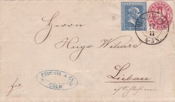 2 Sgr. dunkelblau, etwas knapp, in Mischfrankatur mit 1 Sgr. rosa (Schere) auf Brief 1862 mit K2 "Coeln Bahnhof"