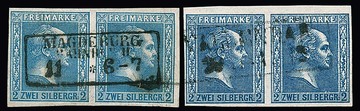 2 Sgr. blau, Plattenfehler "Retusche" (schräges "I", sign. Engel, Kabinett) und "Schnupfnase" je gestempelt. Mi. 550,-