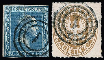 2 Sgr. blau, Kabinettpaar mit Ra2 "Potsdam", sowie dunkelblau auf Kabinettbriefstück mit Ra3 "Berlin Stadt-Post-Exp. XIII" (sign. Brandes)