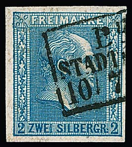 2 Sgr. blau, Plattenfehler "schräges I" (Retusche) tadellos gest. Mi. 400,-