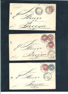 1 Sgr. karmin einzeln und doppelt auf zwei Ganzsachen-Couverts 1 und 2 Sgr., sowie Ganzsache 3 Sgr. braun, alle drei aus gleicher Korrespondenz von Magdeburg nach Treysa