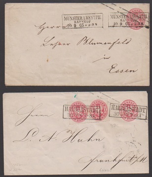 1 Sgr. rosa, zwei Briefe, mit rundgeschnittenen Freimarken bzw. rundgeschnittenen Ganzsachen-Ausschnitten (auf Ganzsache 1 Sgr.)