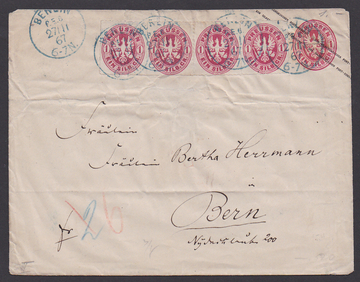 1 Sgr. rosa, prachtvoller Viererstreifen auf Ganzsache 1 Sgr. rosa im Großformat (Falten und rs. Öffnungsmgl.), mit blauem K1 "Berlin P.E.6" 1867 nach Bern/Schweiz