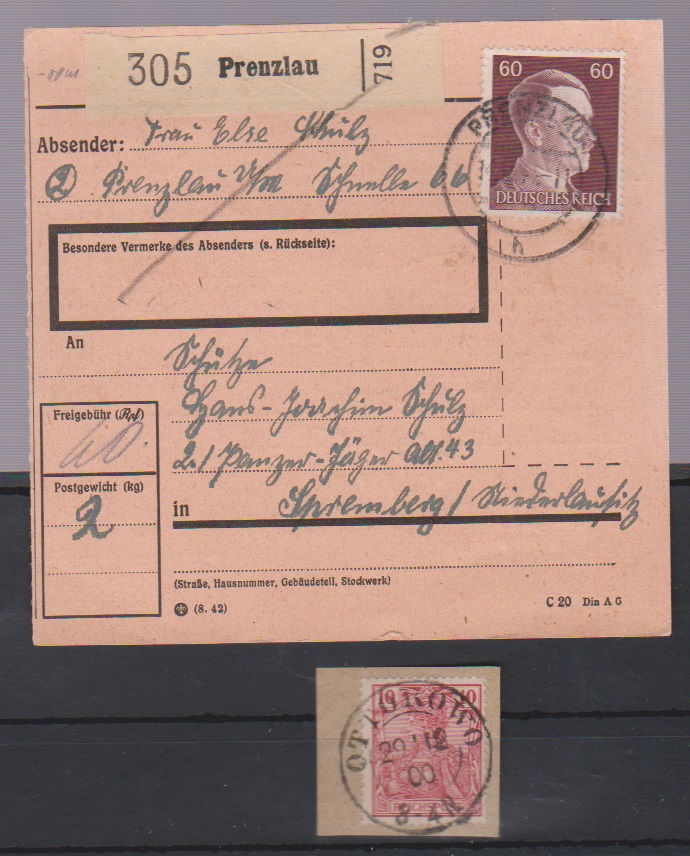 "Prenzlau", 1944, aptierter Preußen-Ra2 als Ra1 noch spät im Innendienst verwendet auf Paketkarte mit 60 Pfg. Hitler von dort (Feuser unbekannt), dazu Paketkarten-Abschnitt mit aptiertem Ra2 "Ohligs", sowie K2 "Ottrowo" auf Briefstück 1900