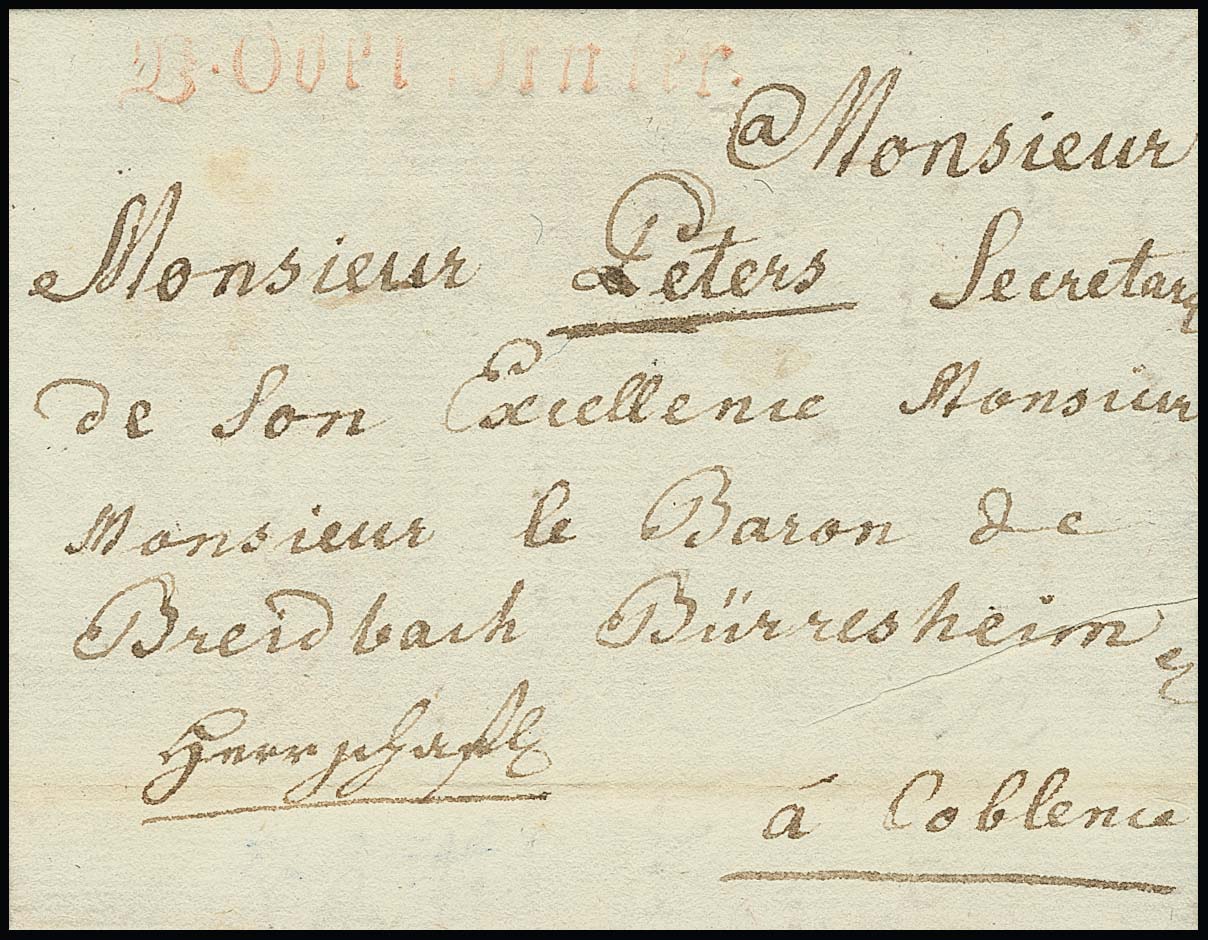 "Oberwinter", 1789, typisch zarter Abschlag des seltenen roten Fraktur-L1 "V. Oberwinter" auf Brief mit Inhalt aus Breitbach, Feuser 2586-1/800,-