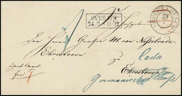 "Overath", 1834, seltener K1 auf Luxus-Paketbegleitbrief nach Düsseldorf, ferner Ra2 1853, nebst K2 "Hülsenbusch", auf dekor. Nachsendebrief