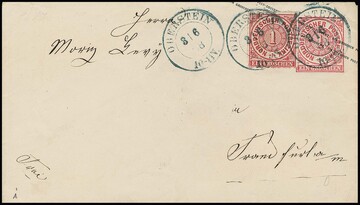 "Oberstein", seltener nachverw. blauer K2 auf NDP-Ganzsache1 Gr. rosa nebst ZuF 1 Gr. rosa