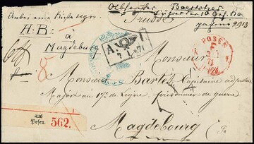 "Posen F.N.1", 1871, roter Franko-K1 auf Paketbegleitcouvert (dieses Randmgl.) an einen französ. Kriegsgefangenen in Magdeburg