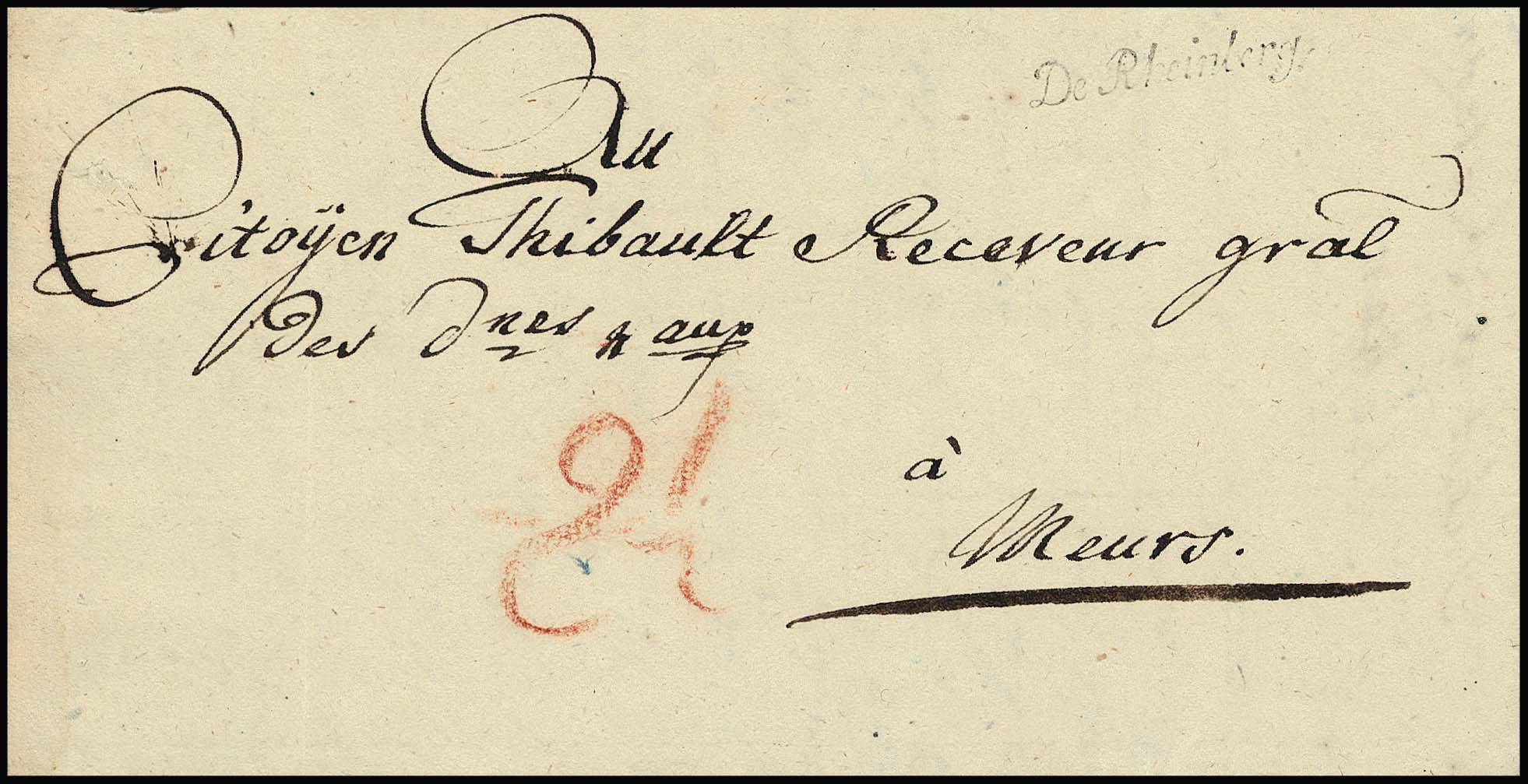 "Rheinberg", (1810), klarer roter L2 "P.103.P. RHINBERG" auf Brief (Laufweg "franco Duisburg" hs. geändert in "Rhein")