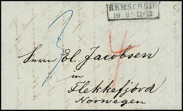 "Remscheid", Ra2 1862 auf seltenem Brief nach Norwegen in den entlegenen Ort Flekkefjord