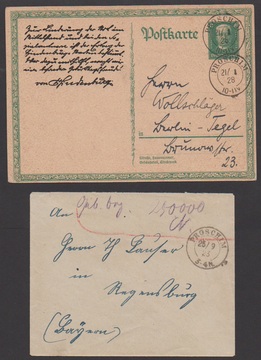 "Proschim", spät nachverwendeter Preußen-K2 auf Infla-"Gebühr bezahlt"-Brief 1923, sowie auf Hindenburg-Ganzsachenkarte 8 Pfg. 1928