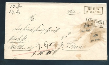 "Rhein", "Loetzen", 1862, je klarer Ra2 auf Paketbrief mit zwei Klebezetteln (schwarzer Druck, "965" bzw. "966 Aus Rhein")