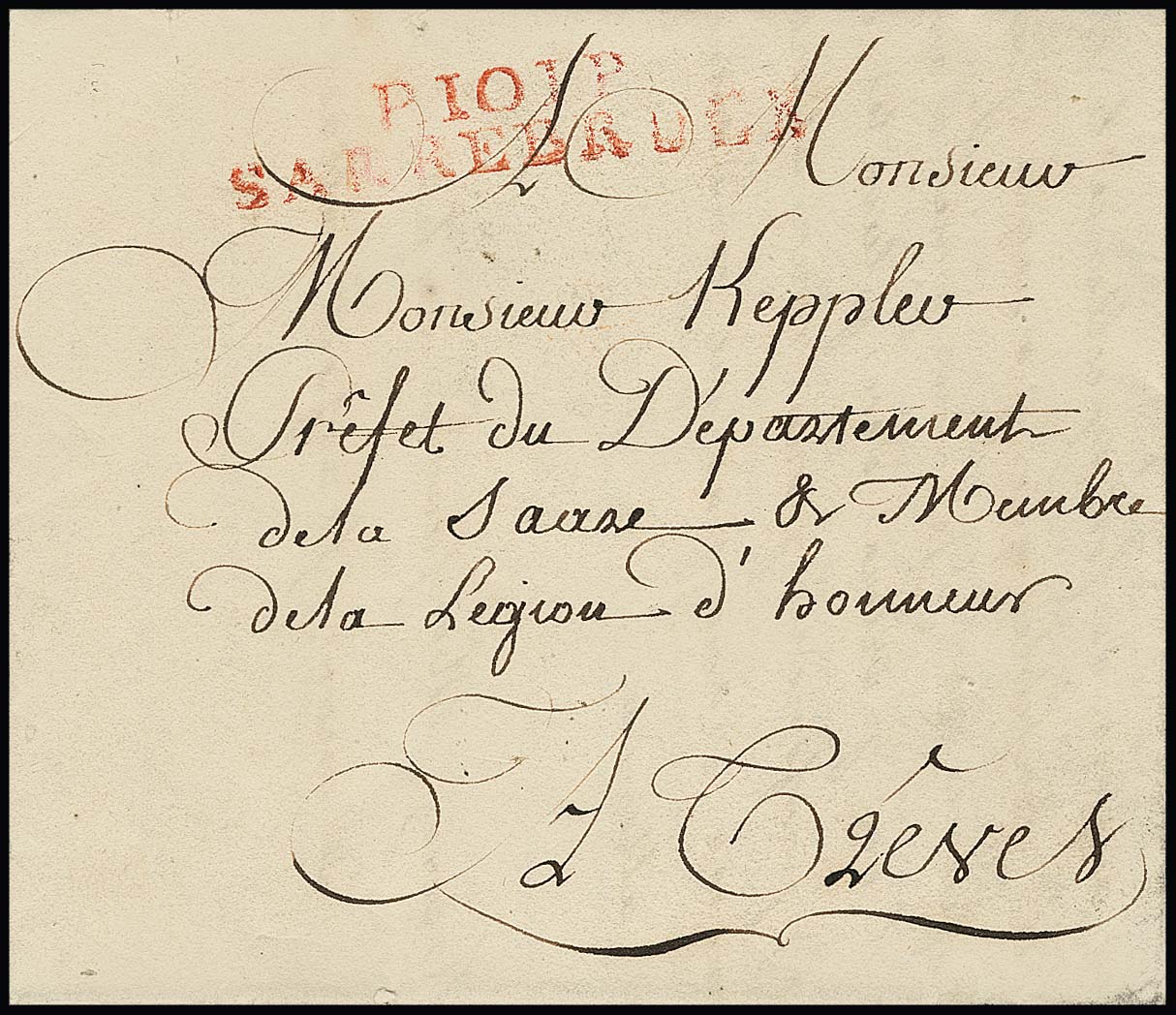 "Saarbrücken", 1803, "101 SARREBRUCK", klarer L2 auf Kabinettbrief nach Niederbronn, "abzugeben bei Herrn Pfarrer Franz No. 103 auf dem Fischmarkt in Straßburg"