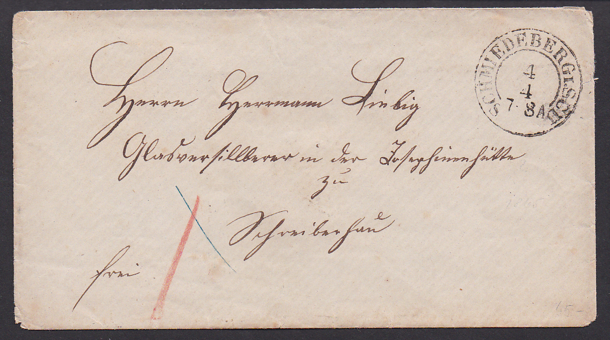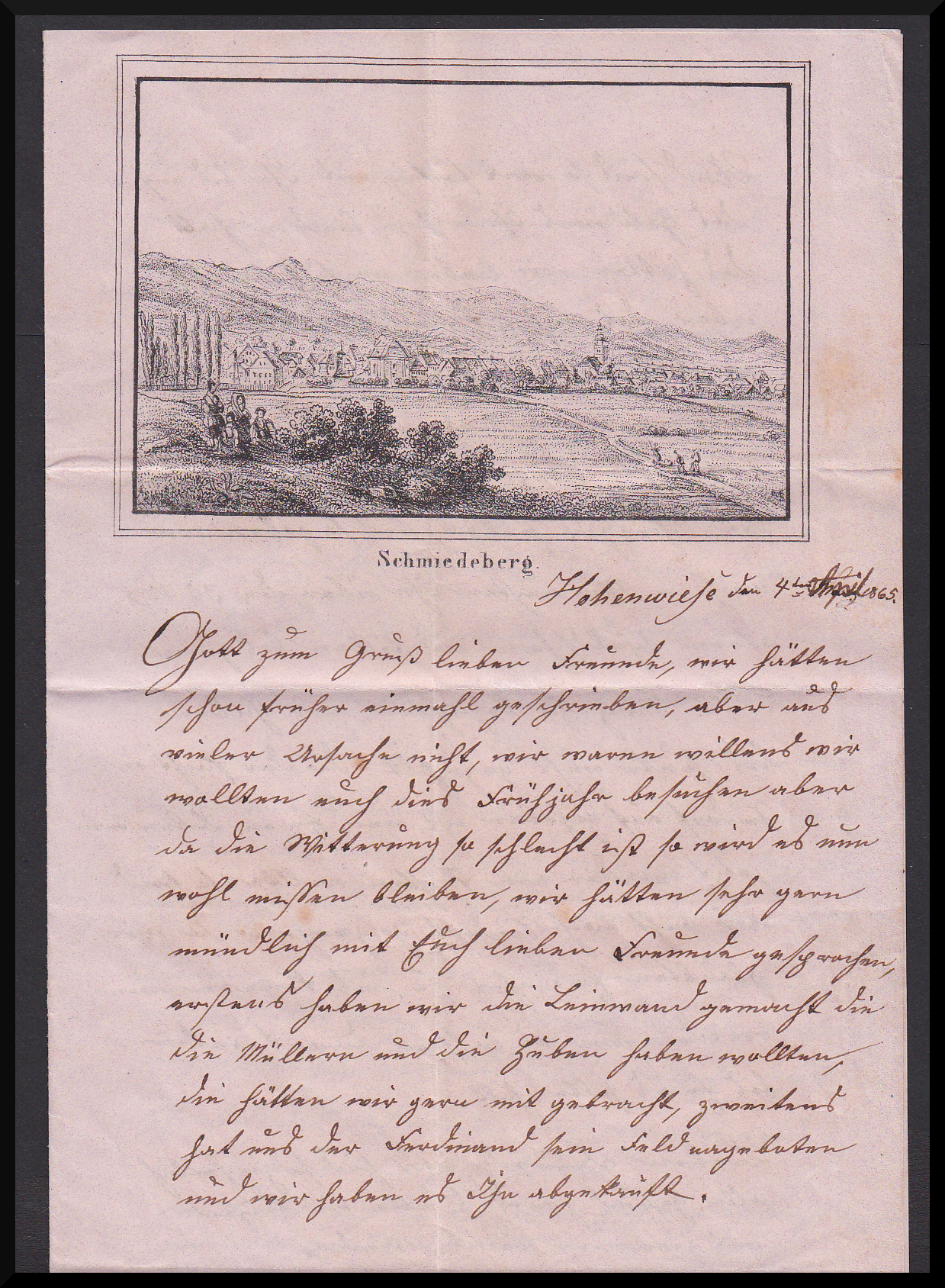 "Schmiedeberg", 1865, offener K2 auf Couvert mit zugehörigem Briefinhalt, dieser hübscher rosa Briefbogen mit Abb. der Stadt (Ansichtskarten-Vorläufer) geschrieben in Hohenwiese