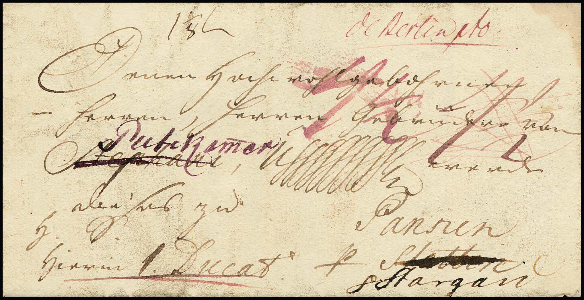 "Berlin", 1743, "DE BERLIN PTO." hs. in roter Tinte auf interessantem Retour-Wertbrief ("hierin 1 Ducat") nach Pansin "p. Stettin" (geändert in "p. Stargard"), mit vielen Taxen und Vermerken