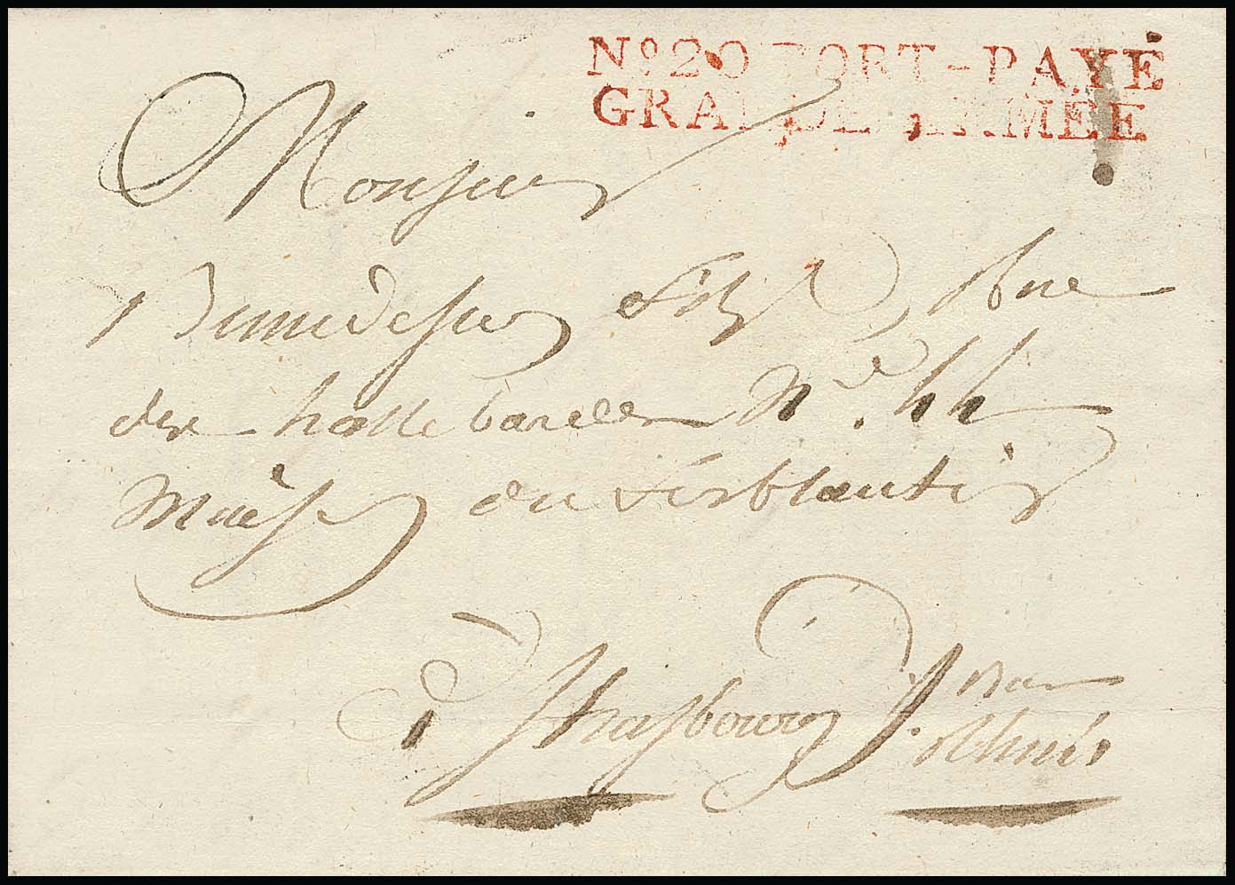 "Berlin", 1807, seltener "Grandé-Armee-Brief" mit vollständigem Inhalt nach Straßburg. Roter L2 "No. 20 PORT-PAYÉ GRANDÉ ARMEE"