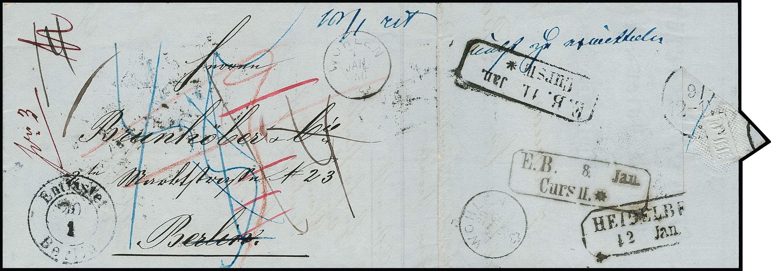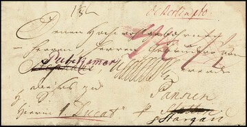 "Berlin Entlastet", 1856, seltener Retour-K2 auf Retourbrief aus Wohlen/Schweiz (K1) nach Berlin und zurück, zahlreiche Taxen und Stempel, hs. "nicht zu ermitteln"