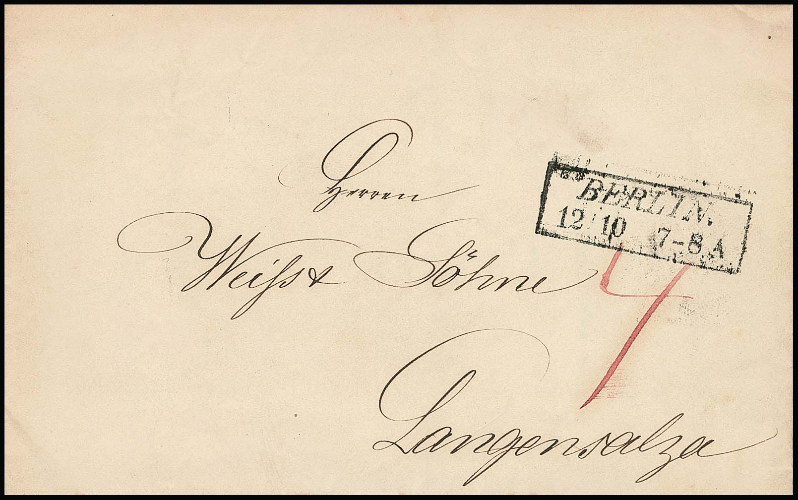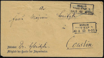 "Berlin Post-Exp. 3", Ra3 vom 10. und 11.2.1863 auf beigem portofreiem Couvert mit Vordruck eines Reichstags-Abgeordneten nach Coeslin