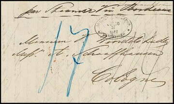 Incoming-Mail, 1862, Brief aus Montevideo/Uruguay via Southampton nach Cöln, der Empfänger mußte "17" Sgr. bezahlen