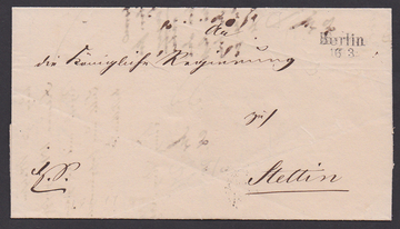 "Berlin", 1838, seltener L2 des Hofpostamtes in bisher frühest bekannter Verwendung, 16.3.1838 (KHBW Nr. 57, erst ab 18.3. gelistet) auf Brief nach Stettin, Feuser Nr. 249-5/500,-