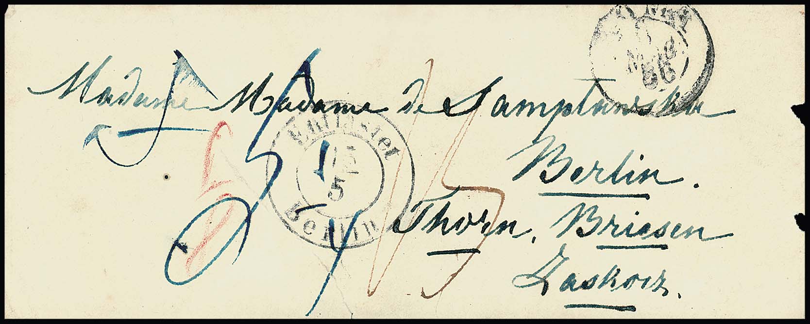 "Entlastet Berlin", guter K2 klar auf Damencouvert (kl. Rißchen) von Rom 1866 nach Berlin/Thorn/Briesen/Zastrow (versehentliche Zustellung, die Orte waren als Transit vorgegeben)