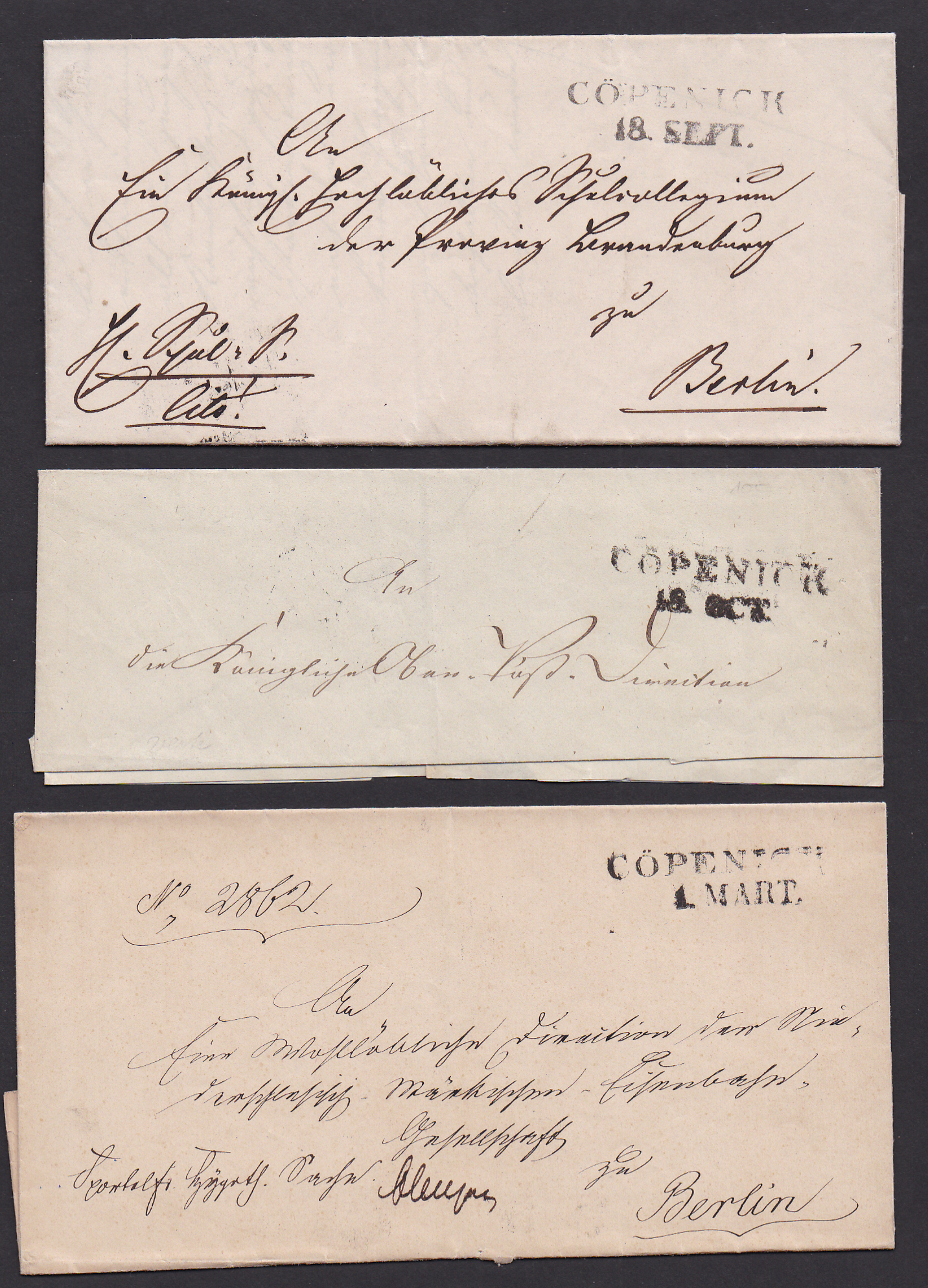 "Berlin", 1865-1871, grüner, violetter und roter Franko-K2 auf drei Briefen, u.a. nach Frankreich