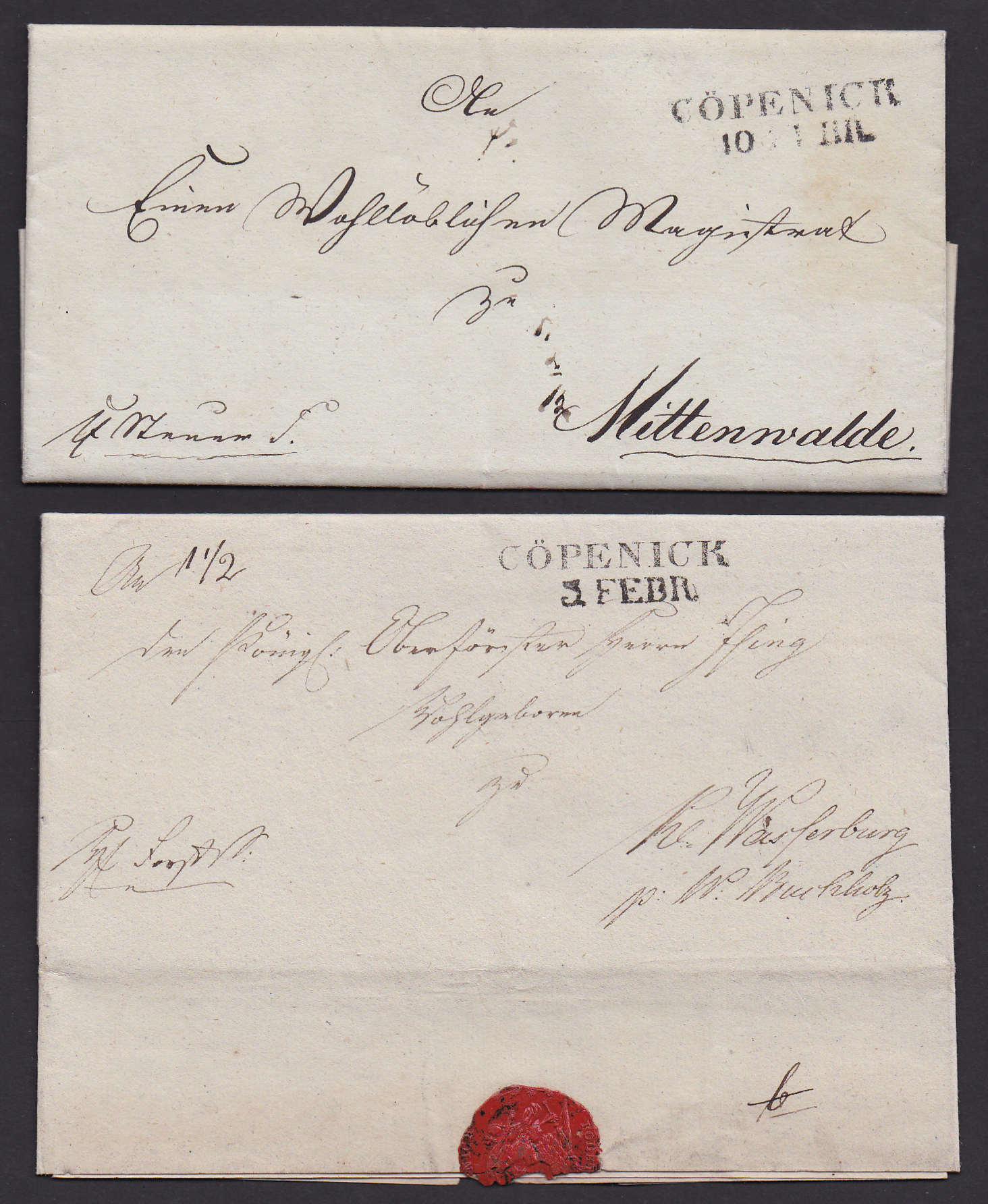 "Berlin", 1856-1859, K2 auf zwei portofreien Paketbriefen mit lith. Vordruck "Angelegenheit des Evangelischen Bücher-Vereins"