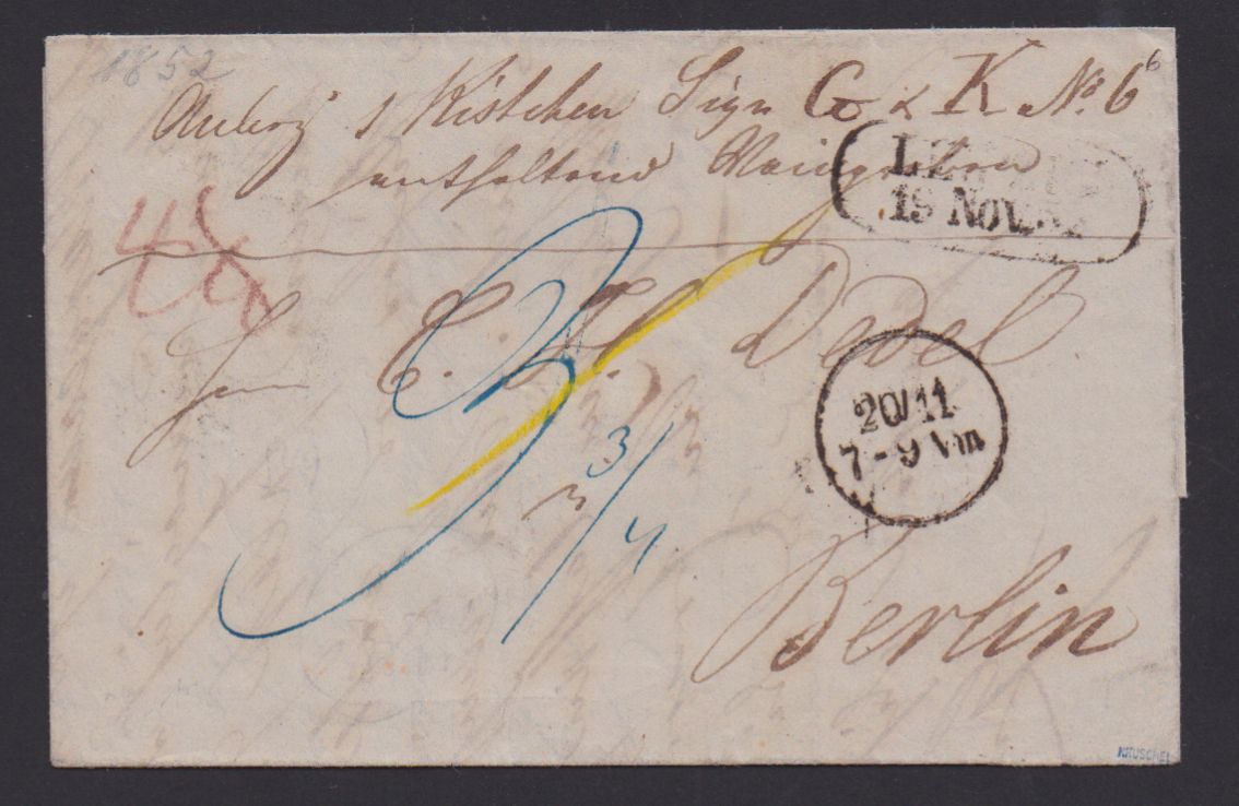 "Berlin", ca. 1854-61, 46 Briefe aus einer Korrespondenz nach England (wenige Briefe Papiermängel), versch. Stempel (Stadtpost-Exp., Anhalter und Potsdamer Bahnhof), versch. Laufwege, Doppelporto etc., interessantes Studienobjekt